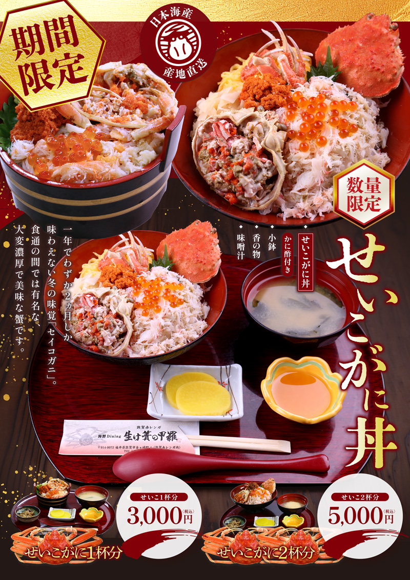 11/7(金)から期間限定メニュー「せいこがに丼」がスタートいたします。 ご来店お待ちしております。 |